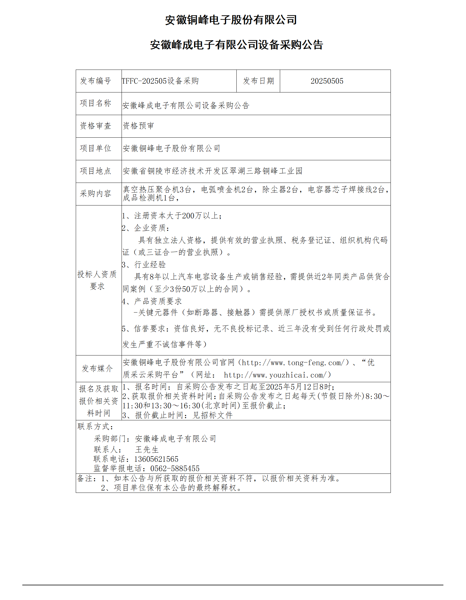 安徽峰成电子有限公司设备采购公告(1)_01