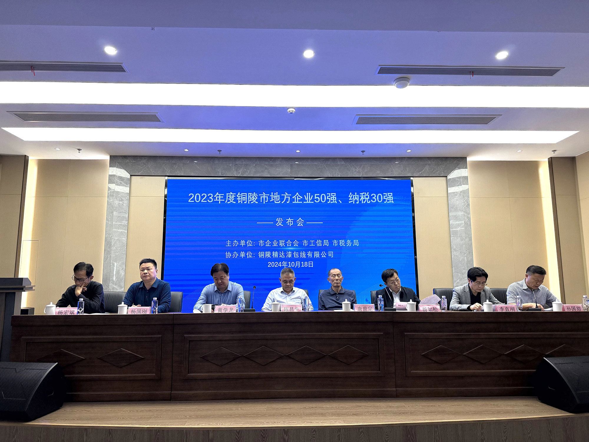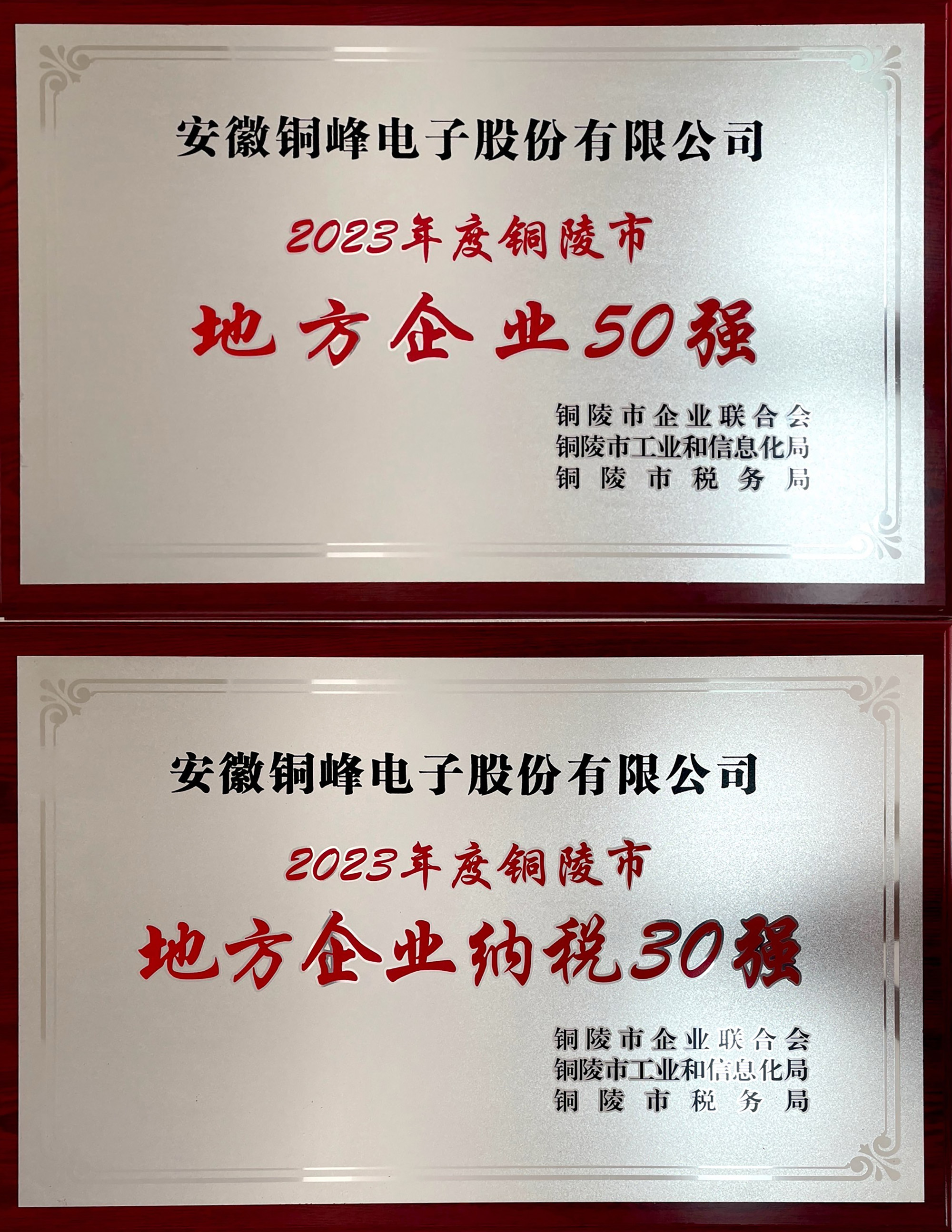 10月18日,由市企业联合会、市工信局、市税务局主办的2023年度铜陵市地方企业50强、地方企业纳税30强发布会举行,公司再次荣获“地方企业50强”“地方企业纳税30强”两项荣誉。公司副总经理、财务总监郭传红代表公司现场领取荣誉牌匾。