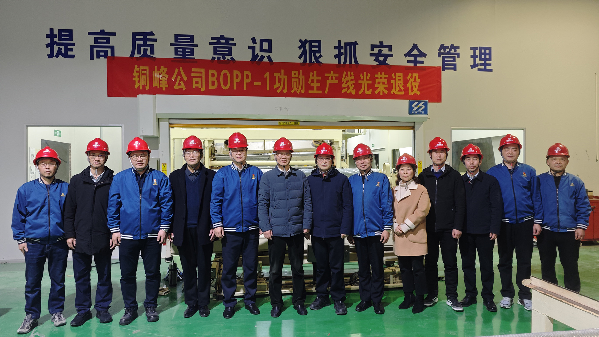 图为公司党政领导班子和电容薄膜分公司管理人员与BOPP-1功勋线合影留念