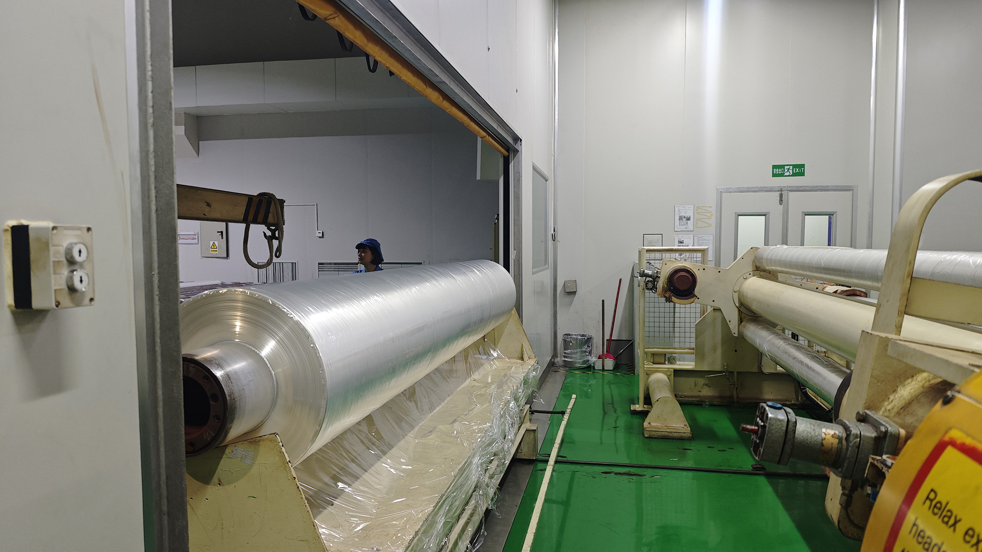图为BOPP-1生产线正式退役前最后一卷薄膜产品下线