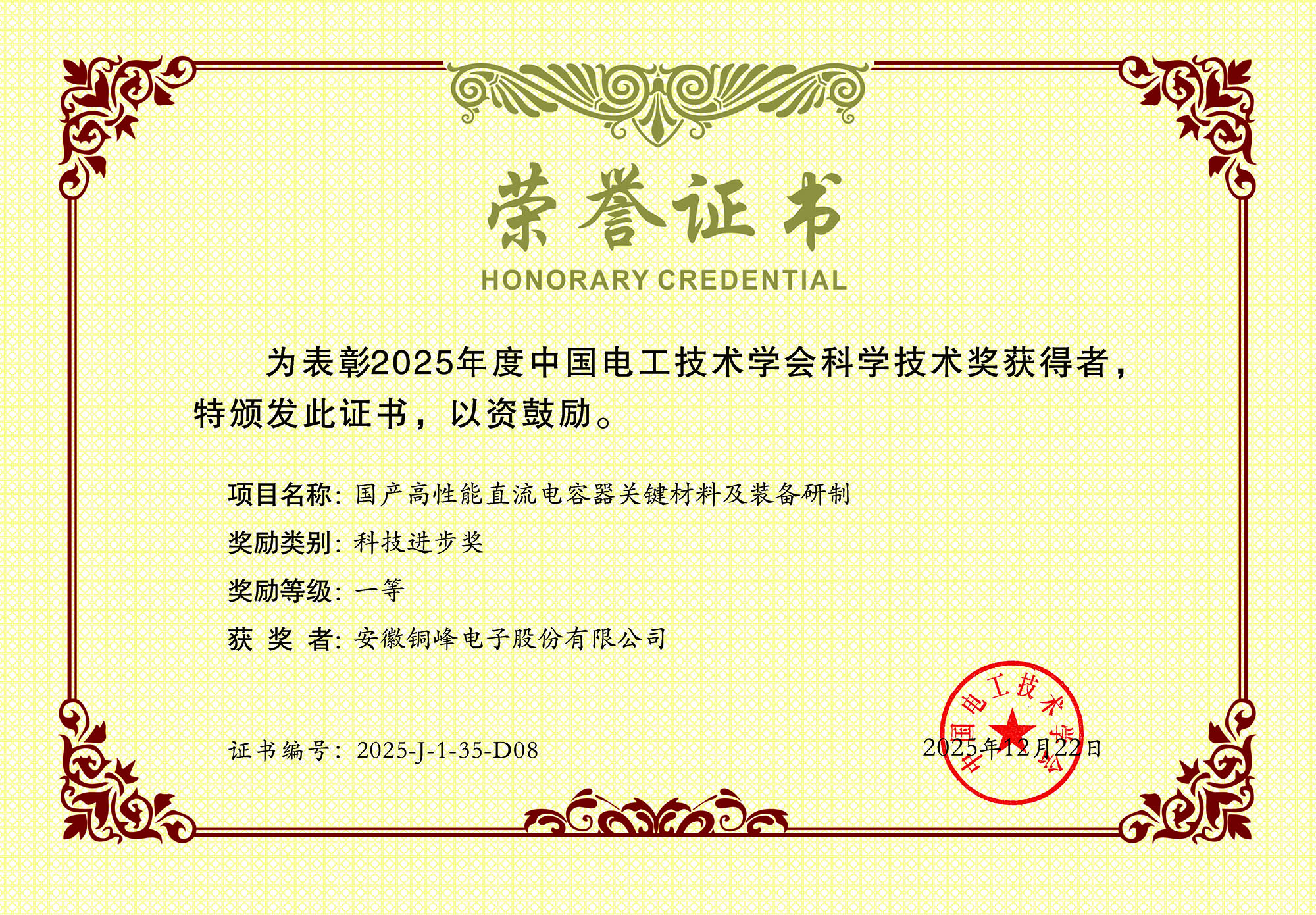 近日,公司参与的合作项目“国产高性能直流电容器关键材料及装备研制”荣获2025年度中国电工技术学会科技进步一等奖。